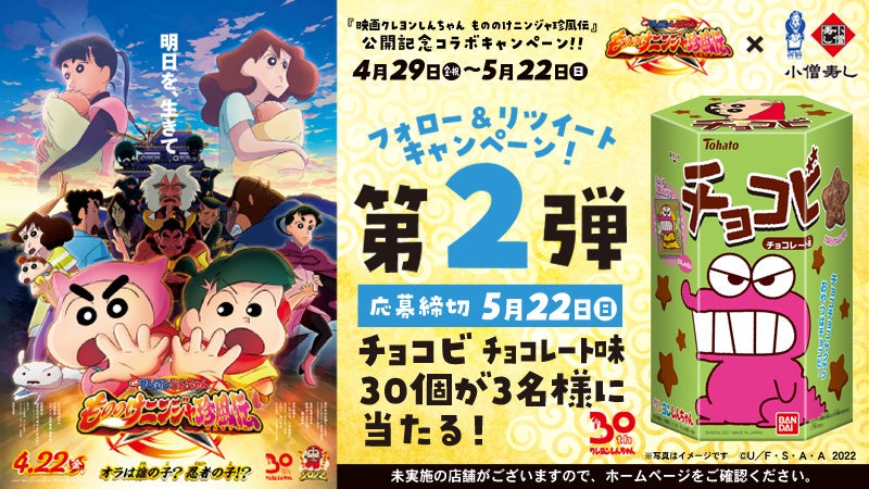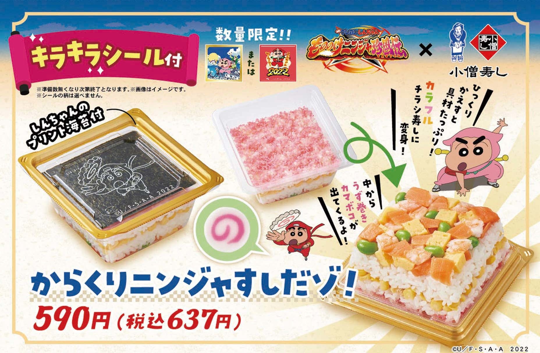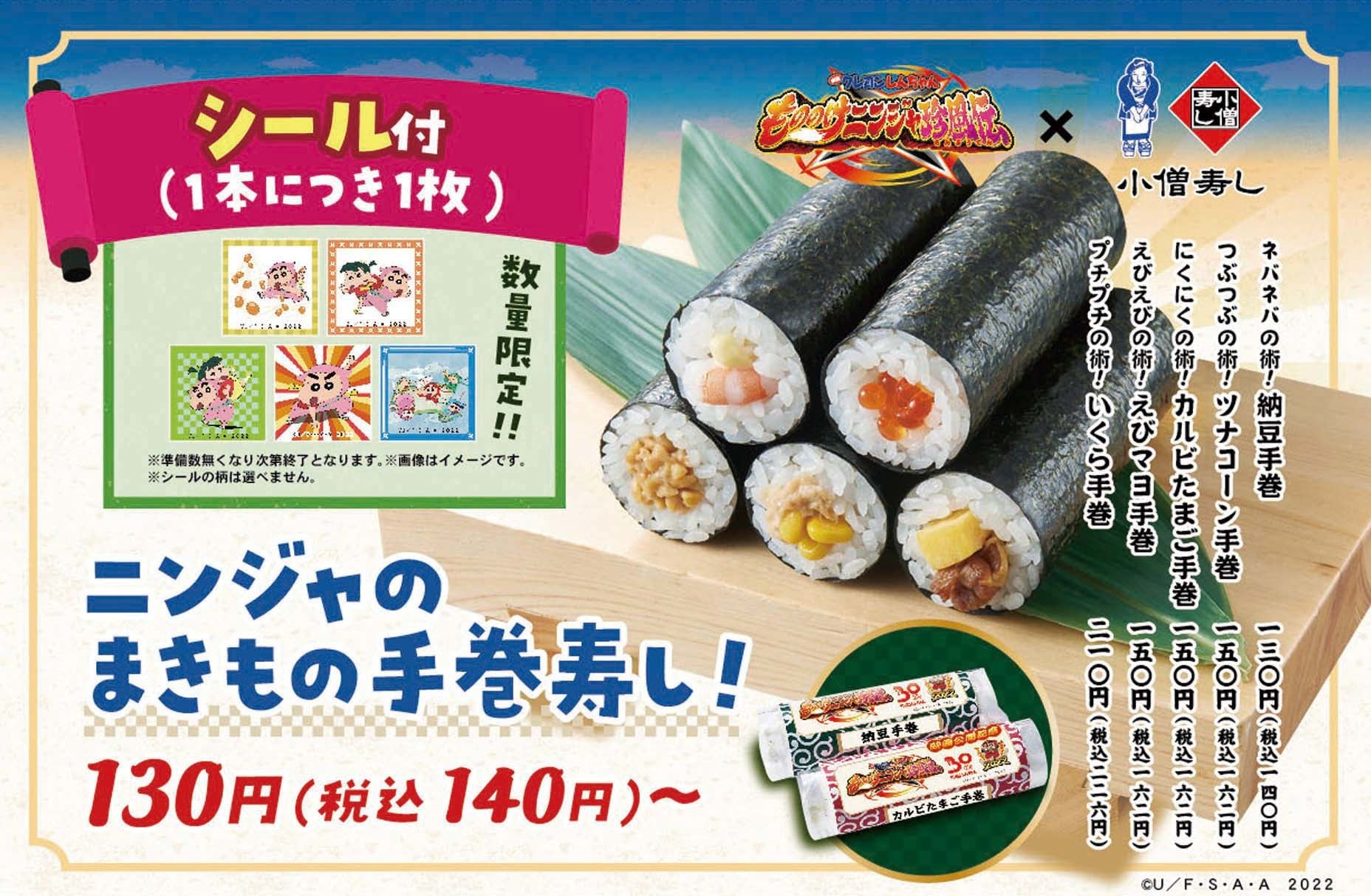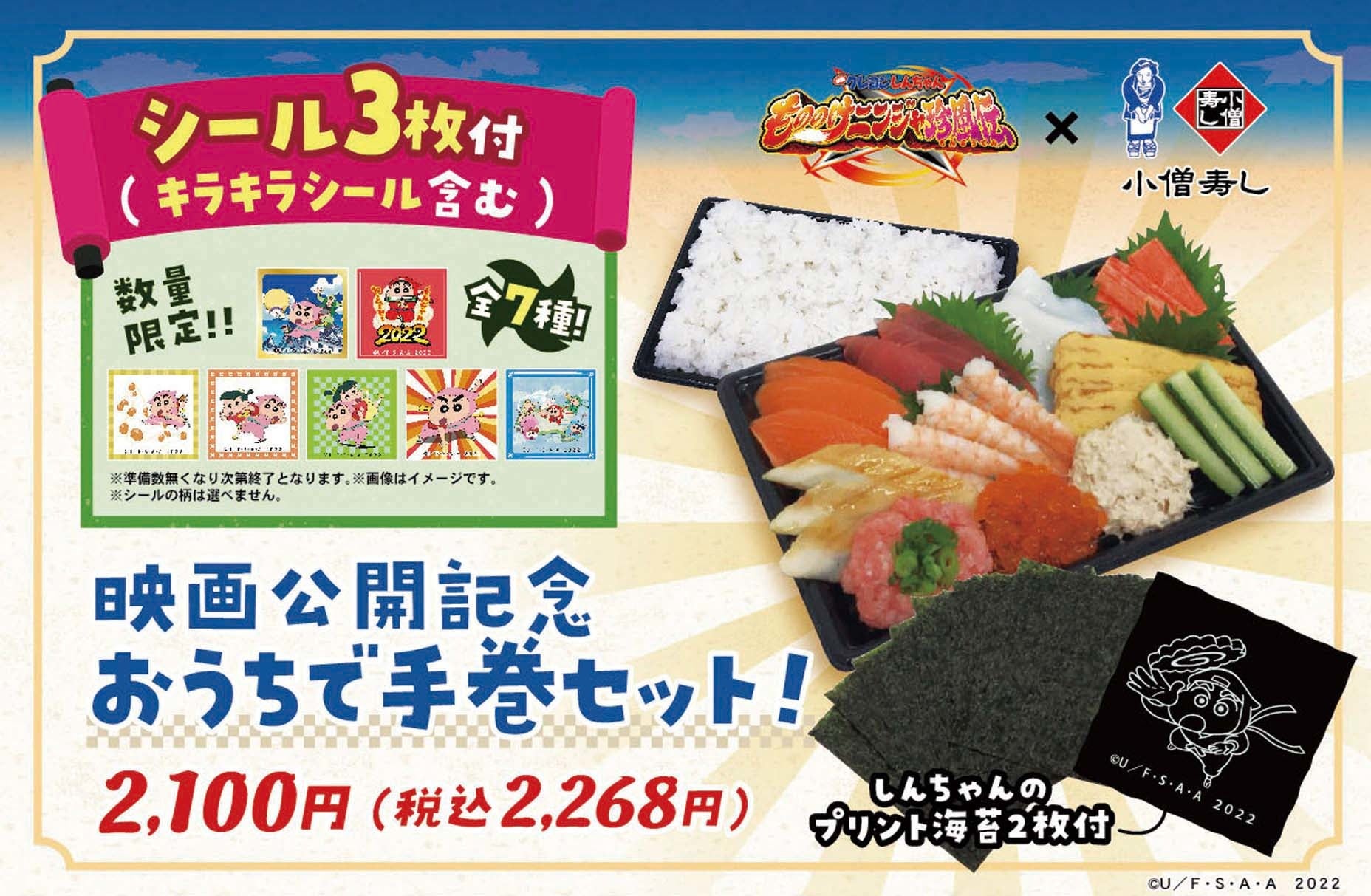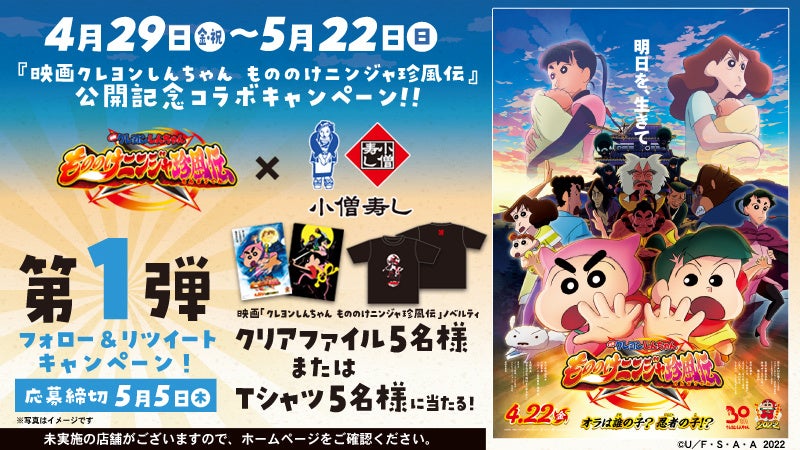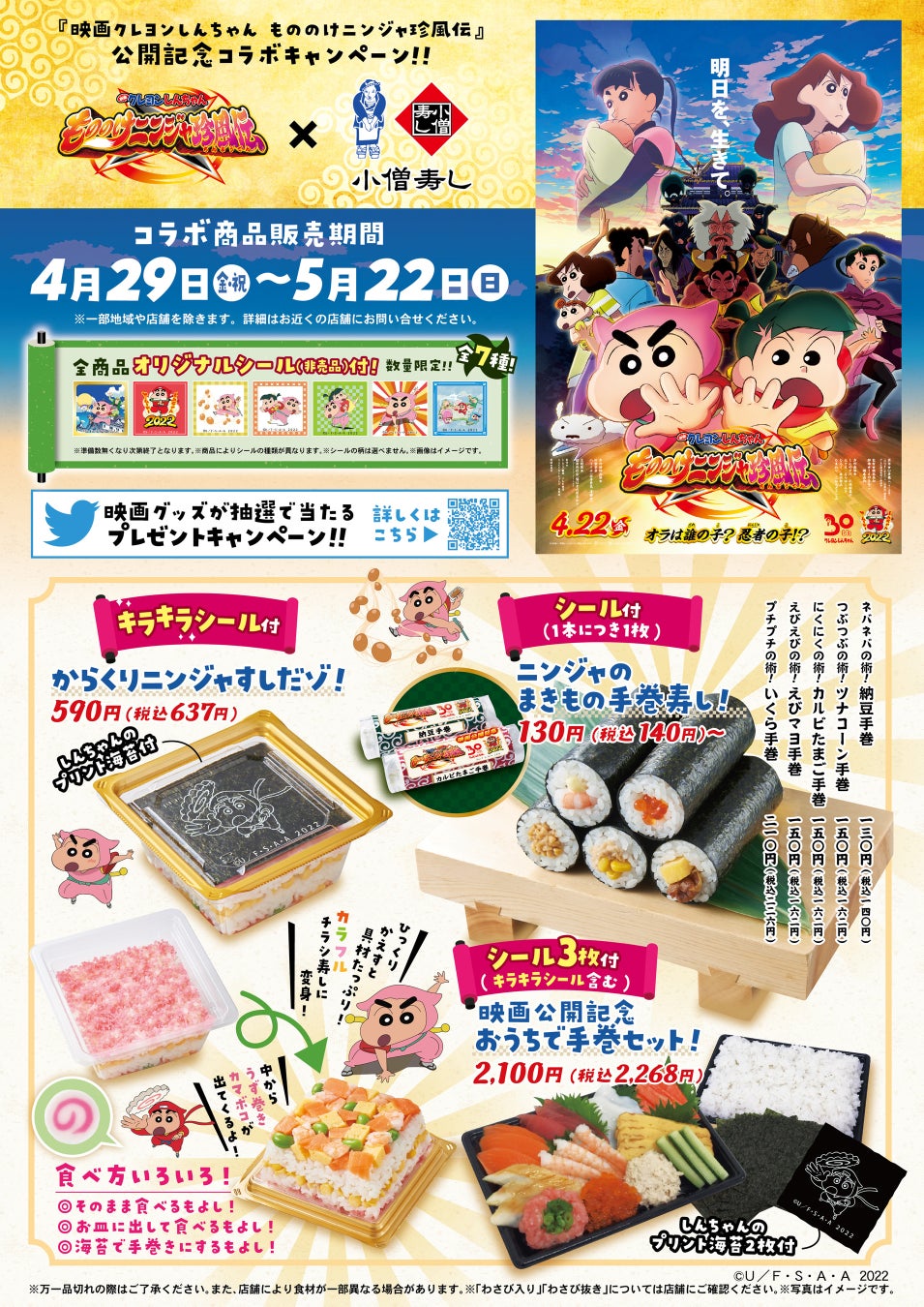 株式会社小僧寿しは、2022年4月29日(金)~2022年5月22日(日)までの期間限定で、 4月22日(金)公開の『映画クレヨンしんちゃん もののけニンジャ珍風伝』とのコラボ企画を開催!