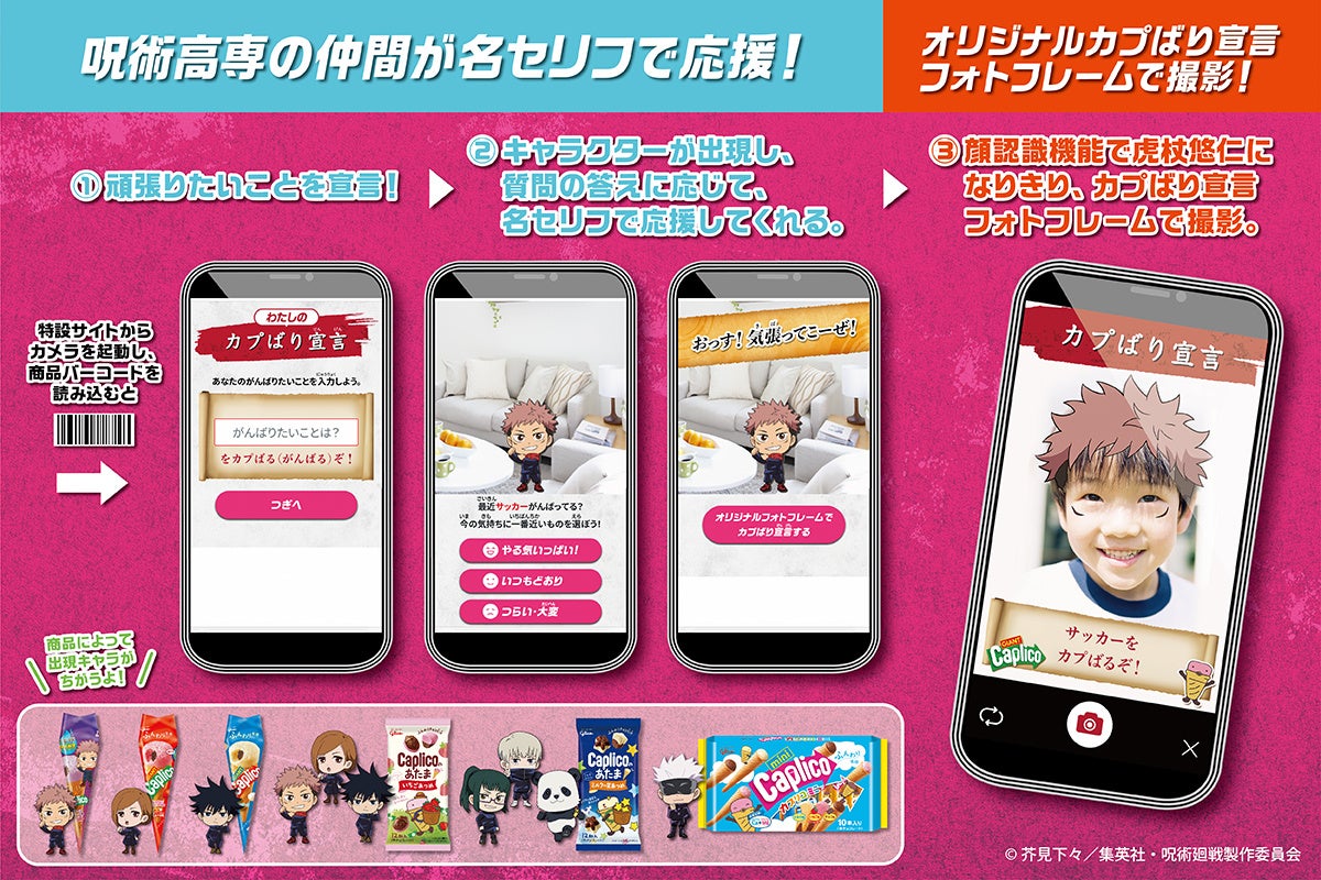 さらに、キャンペーン特設サイトにアクセスし、「カプリコ」ブランド商品のバーコードをスマートフォンで読み取ると、「呪術廻戦」のキャラクターが画面上に出現し、全7種のキャラクターがそれぞれの名セリフで応援してくれる「がんばり応援プロジェクト 親子で領域展開キャンペーン」が実施されます。応援メッセージの後には、自分の顔をキャラクターに当てはめてなりきり、頑張りたいことを入力できる、オリジナル「カプばり宣言フォトフレーム」がもらえます。お子様が興味のあることやチャレンジしたいことを知ることができ、親子のコミュニケーションを増やすことが目的です。