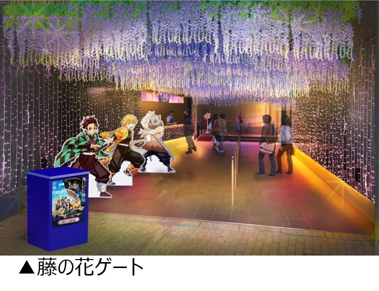 「鬼滅の刃」劇中で登場する藤の花の世界観を演出しております。併設するショップでは、ドリンクやフード、オリジナルグッズを販売しております。