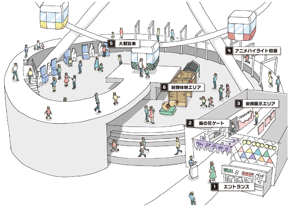 全64枚からなる『テレビアニメ「鬼滅の刃」無限列車編』と『テレビアニメ「鬼滅の刃」遊郭編』のハイライトシーンがストーリーに沿って展示してあります。観覧車乗車までの期待感を高めていきます。