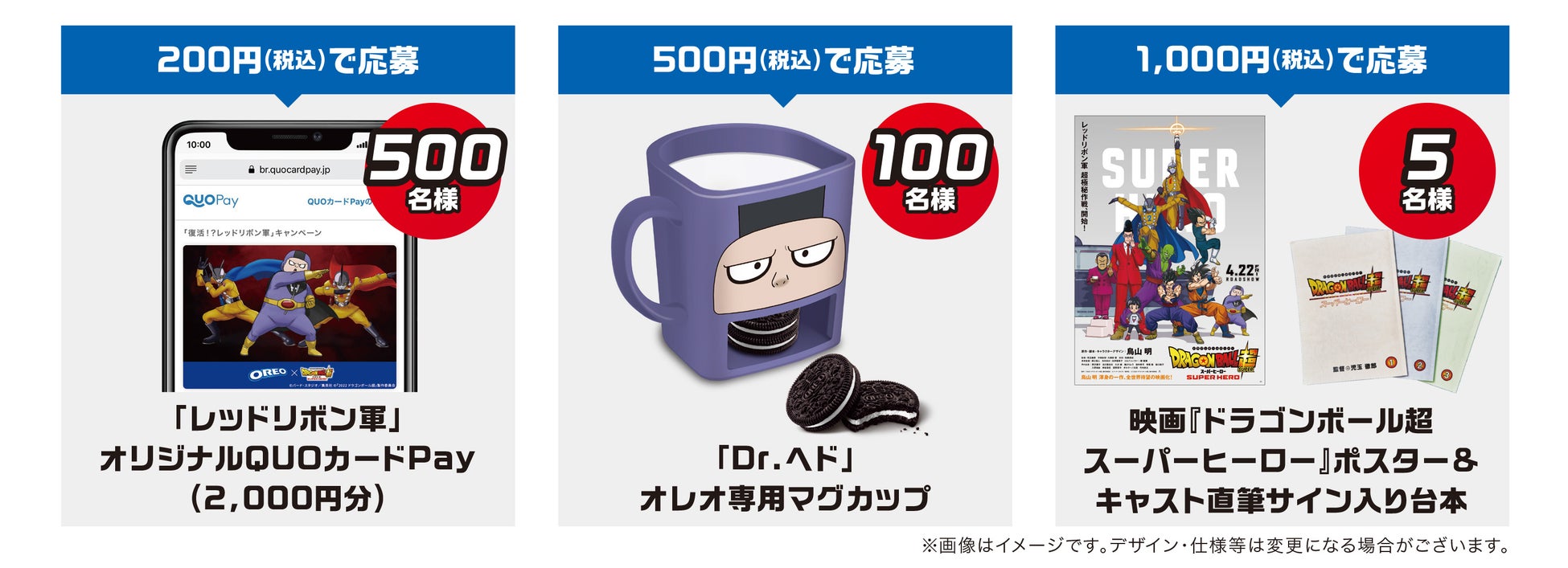 期間中にオレオ製品を購入のうえ、レシートで応募すると、映画「ドラゴンボール超 スーパーヒーロー」ポスター・キャスト直筆サイン入り台本セットや、劇中でオレオ風クッキーを食べているDr.ヘドがモチーフで、上に飲み物、下にオレオが収納できるマグカップ、オリジナルデザインのQUOカードPayが当たるキャンペーンも実施されます。今だけ期間限定、本コラボキャンペーンでしか手に入らないオリジナルグッズをゲットしよう!