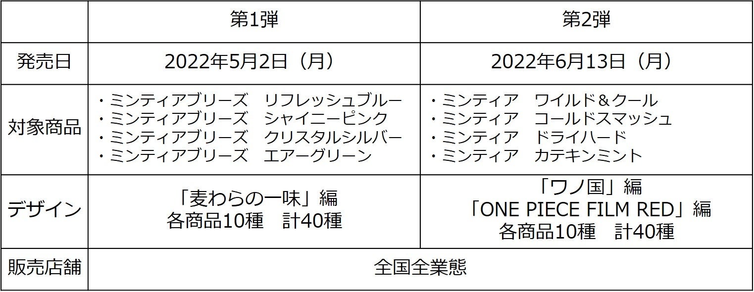 第1弾は「ミンティアブリーズ」シリーズ4商品を対象として、主要キャラクターである「麦わらの一味」10人がパッケージに描かれており、第2弾は「ミンティア」シリーズ4商品を対象として、「ワノ国」編の人気キャラクターを加えた計19人と、8月公開の『ONE PIECE FILM RED』のオリジナルデザインが描かれています。合計で80種類のパッケージデザインを楽しむことができます。