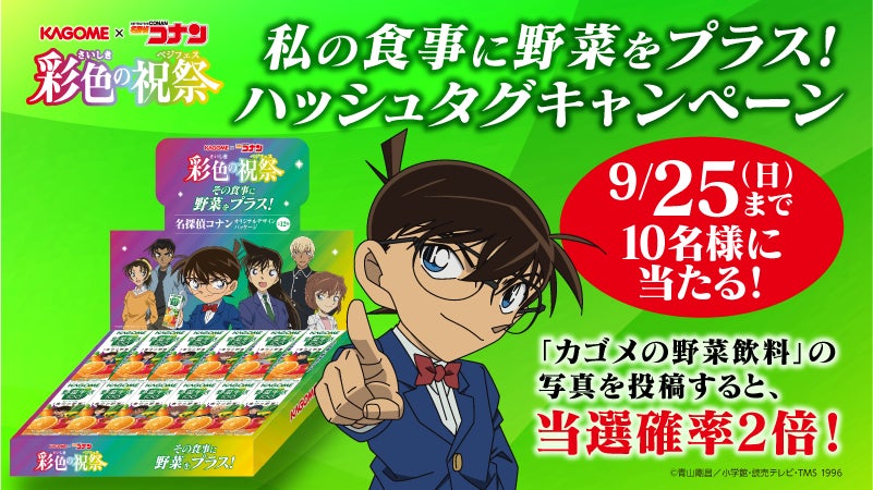キャンペーンに先駆けて、9/5(月)〜9/25(日)の間、カゴメ公式Twitterアカウント(@KAGOME_JP)にて抽選で10名様に『名探偵コナン』オリジナルデザインパッケージ詰合せBOXが当たる、「#私の食事に野菜をプラス!ハッシュタグキャンペーン」が実施されます。