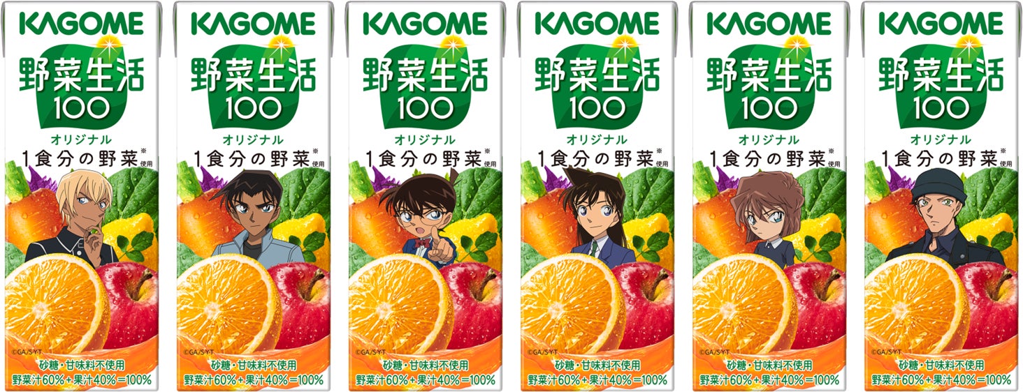 「野菜生活100」4種(オリジナル・ベリーサラダ・マンゴーサラダ・アップルサラダ)の各容器(200ml、720ml、1000ml)で、『名探偵コナン』に登場するキャラクターがデザインされた限定パッケージが販売されます。「野菜生活100 」のパッケージの正面に『名探偵コナン』のキャラクターがデザインされるのは今回が初めてです。全国のスーパーマーケット及びドラッグストア等で、9月下旬より数量限定で販売となります。